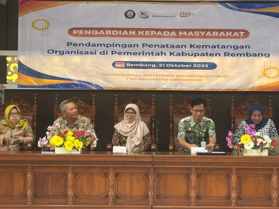 Rembang, October 21, 2025 – In an effort to strengthen effective, innovative, and public service-oriented governance, the community service team from the Department of Public Administration, Faculty of Social and Political Sciences, Diponegoro University, carried out a Community Service Program with the theme “Mentoring for Organizational Maturity Structuring” within the Rembang Regency Government. This activity serves as a tangible manifestation of the synergy between higher education and local government in building a professional, integrity-driven, and innovative bureaucracy.
