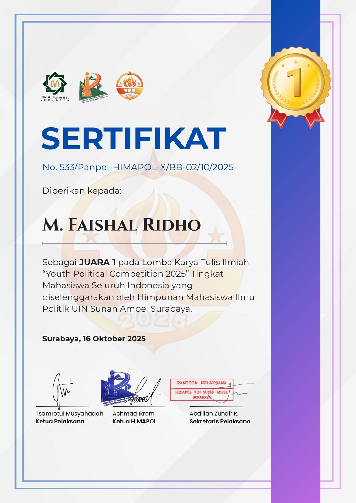 An outstanding student, M. Faishal Ridho, has successfully achieved First Place in the “Youth Political Competition 2025” Scientific Paper Writing Contest for university students nationwide. This competition was organized by the Political Science Student Association (HIMAPOL) of UIN Sunan Ampel Surabaya on October 16, 2025.