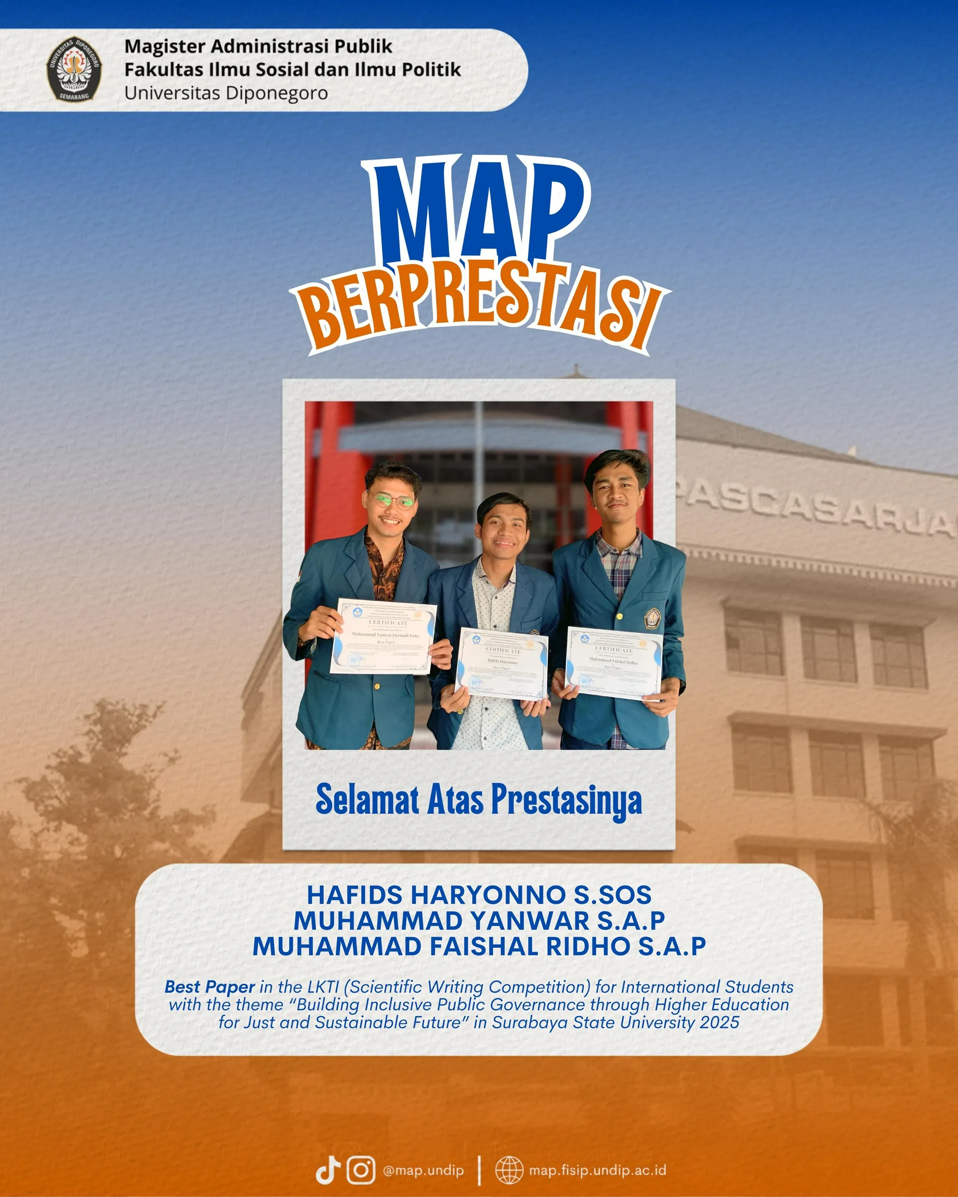 This victory not only reflects the strong academic capacity and analytical skills of the three students but also demonstrates that the scientific works from Diponegoro University, specifically the MAP study program within the Faculty of Social and Political Sciences (FISIP), are capable of competing on the international stage.