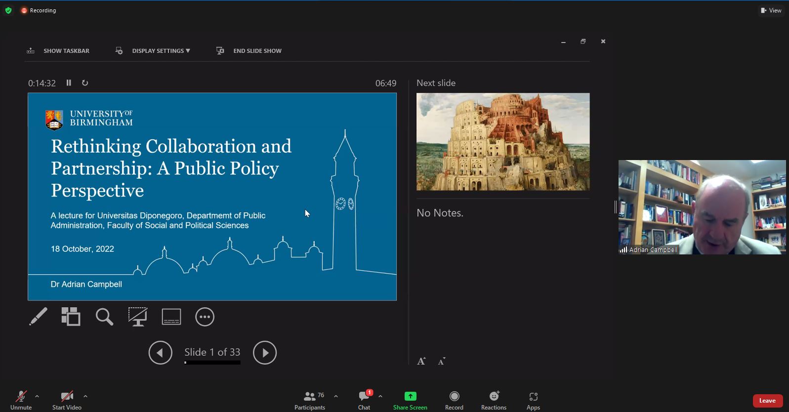 Semarang (18/10) – Master of Public Administration, Faculty of Social and Political Sciences, Universitas Diponegoro has just held a Visiting Lecturer activity with the theme Rethinking Collaboration and Partnership: A Public Policy Perspective. The activity, which took place on Tuesday, October 18, 2022, was carried out through a Zoom meeting and was attended by the Chairperson of the Master of Public Administration Study Program, Dr. Augustin Rina Herawati, M.Si and Vice Dean for Academic and Student Affairs, Dr Teguh Yuwono, M.Pol. admin. Meanwhile, the speaker at this Visiting Lecturer was Dr Adrian Campbell from the University of Birmingham.