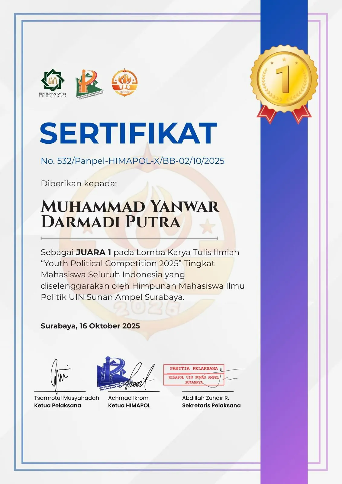 An outstanding student, Muhammad Yanwar Darmadi Putra, has successfully achieved First Place in the “Youth Political Competition 2025” Scientific Paper Writing Contest for university students nationwide. This competition was organized by the Political Science Student Association (HIMAPOL) of UIN Sunan Ampel Surabaya on October 16, 2025.