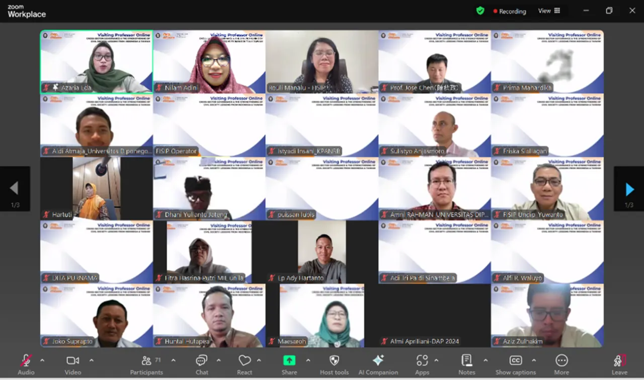 Semarang, August 20, 2025 – The Public Governance Research Group (KBK Governansi Publik), Faculty of Social and Political Sciences (FISIP), Diponegoro University, successfully organized the Visiting Professor Online 2025 as part of UNDIP’s World Class University (WCU) program. This activity featured Prof. José Chiu-C. Chen from the Department of Public Management and Policy, Tunghai University, Taiwan, and Prof. Dr. Dra. Hartuti Purnaweni, MPA from the Department of Public Administration, FISIP UNDIP, who also serves as the Head of the Public Governance Research Group, under the theme “Cross-Sector Governance and the Strengthening of Civil Society: Lessons from Indonesia and Taiwan.”