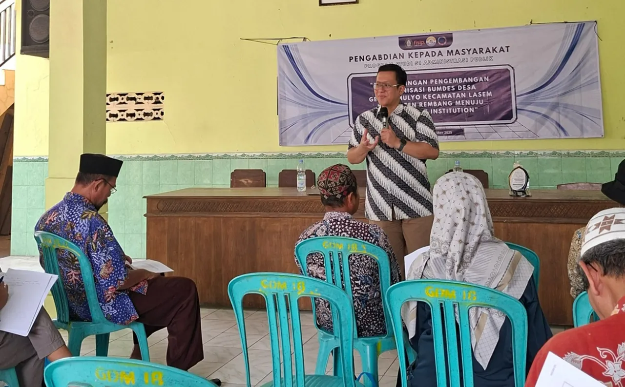 Rembang – A team of lecturers from the Department of Public Administration carried out a community service program focused on strengthening the institutional capacity of the Village-Owned Enterprise in Gedongmulyo Village, Lasem District, Rembang Regency. The activity, held at the Gedongmulyo Village Office on Tuesday (21/10/2025), was titled “Mentoring for the Organizational Development of Gedongmulyo Village BUMDes, Lasem District, Rembang Regency Towards a Sustainable Institution.”